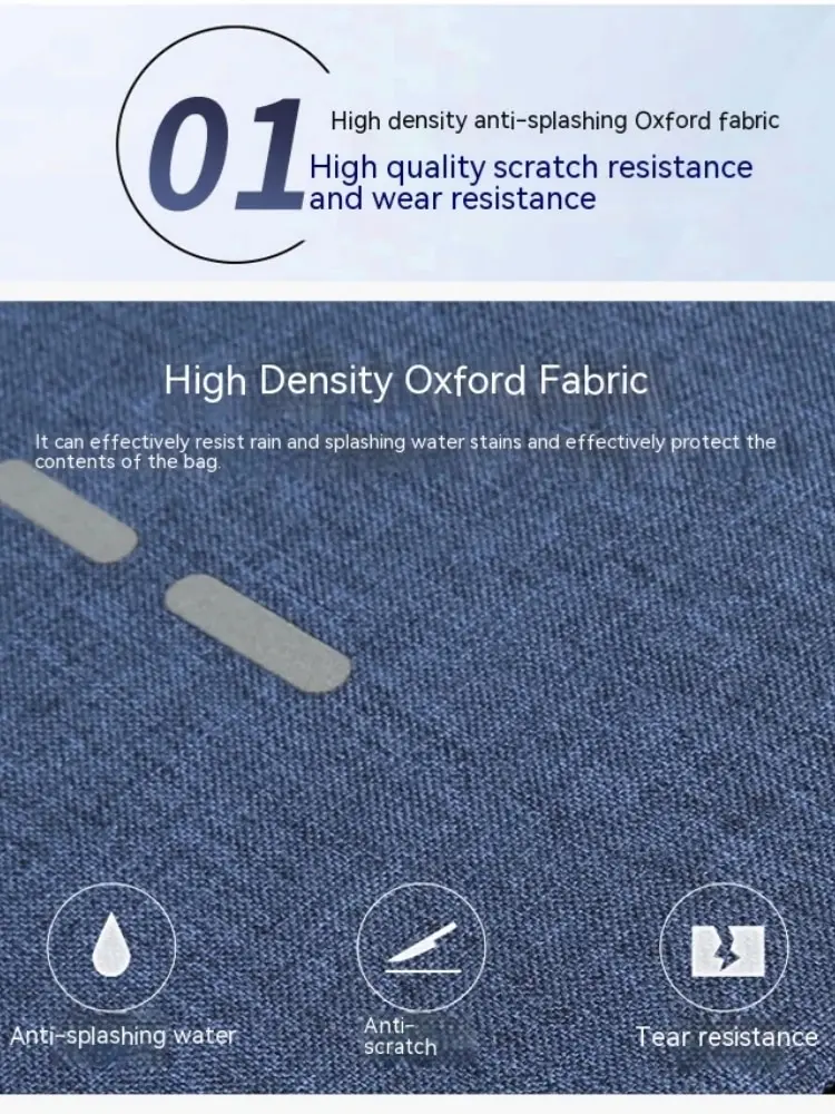 1. High-density Oxford cloth fabric with water resistance provides high quality, scratch and wear resistance. It can effectively resist rain and water splashes to protect items inside the bag.